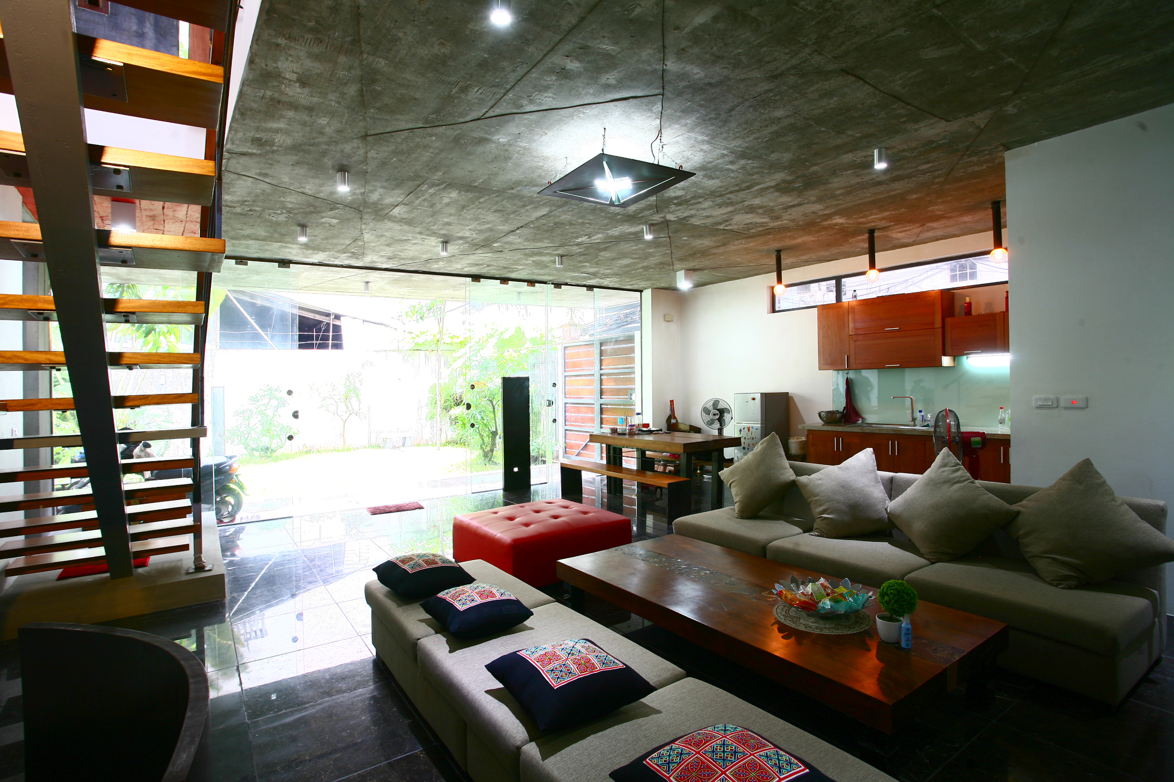 Cầu thang là điểm nhấn thú vị trong không gian, cũng chính là tác phẩm điêu khắc của chủ nhân. Thang và khoảng thông tầng tạo thông gió đối lưu, thuận tiện chiếu sáng tự nhiên. Lan can tay vịn táo bạo như sáng tác của gia chủ.Tầng 2 : 2 phòng ngủ và phòng sinh hoạt chung hướng ra vườn, kết nối khoảng thông tầng hiệu quả.Ban công đua rộng, tạo ấn tượng mạnh, là khoảng đệm tránh mưa nắng trực tiếp vào phòng. Đây cũng là điểm khác biệt, kết nối không gian và trưng bày các tác phẩm điêu khắc.