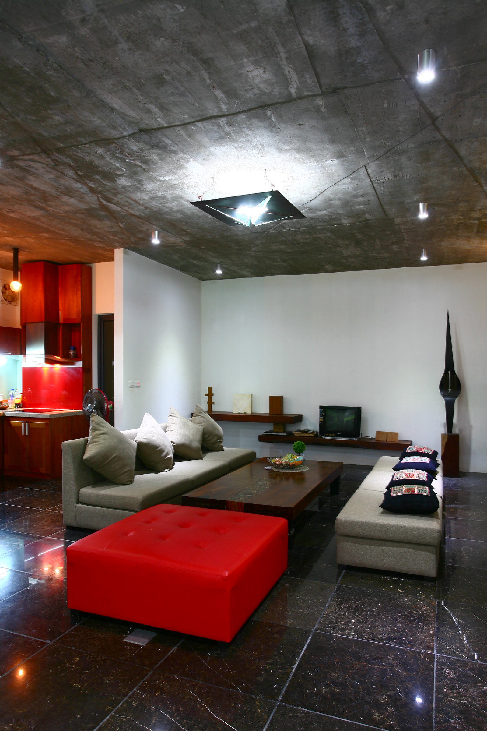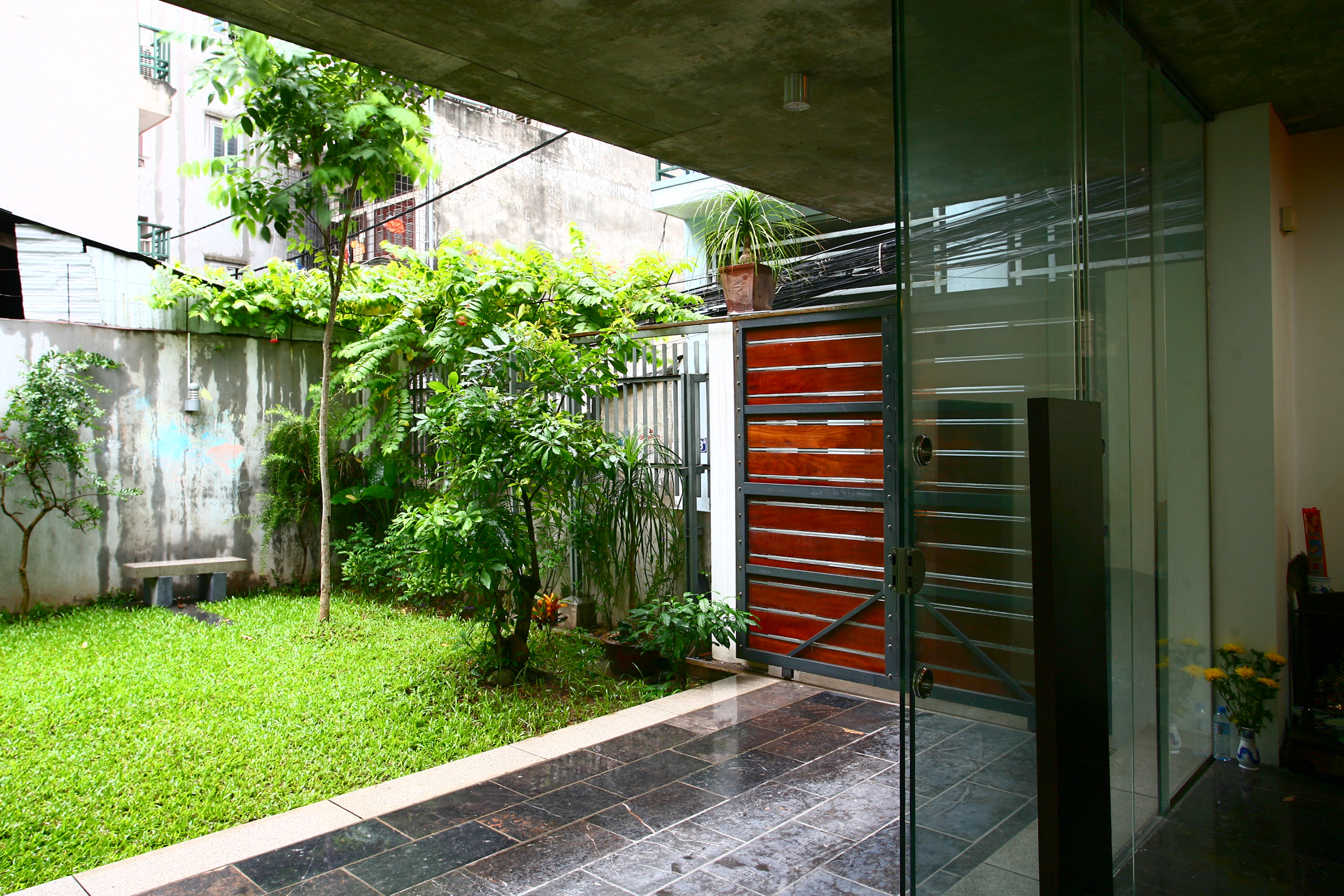 Ý tưởng là một gợi ý có thể nhân rộng. Trong các ngõ phố chật hẹp, từ 3-5 nhà có khả năng tự thỏa thuận tạo ra 1 khoảng trống kết nối thành ốc đảo xanh, mở ra khoảng không gian đối nội yên tĩnh... Công trình có phong cách tối giản, vật liệu bê tông trần, kính không đố khổ lớn, sỏi cuội... Hình khối có tính điêu khắc dứt khoát, vẻ đẹp tự thân không trang trí rườm rà.