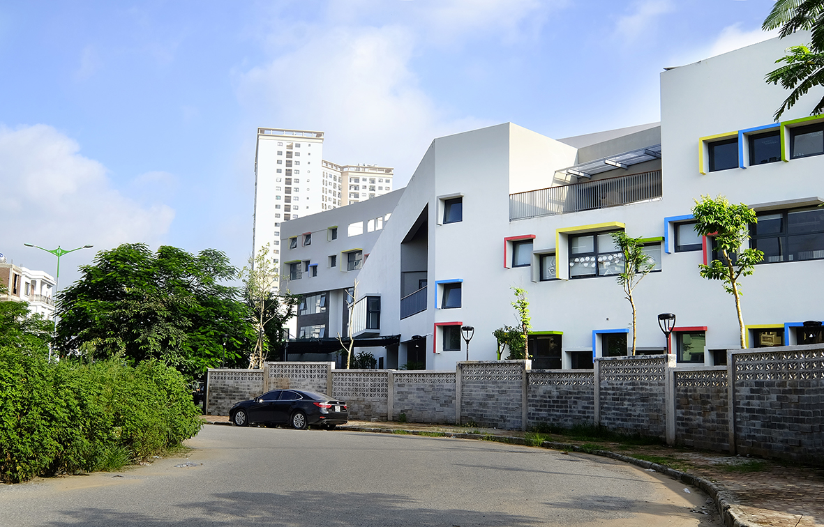 Khối thể dục, thể thao và canteen được đặt ở phía cuối công trình để giảm tiếng ồn & cuối hướng gió. Cả 2 khối này đều được liên kết bởi các hành lang mở. Hình khối chia theo công năng sử dụng các nhóm học, khối 3 tầng phục vụ nhóm tiểu học. Tầng 1, 2 khối 5 tầng phục vụ nhóm trung học cơ sở; tầng 3,4 phục vụ nhóm trung học cơ sở. Tầng 5 dành cho các hoạt động nghệ thuật, âm nhạc, nghiên cứu. Các khối nhà bố trí theo ảnh hưởng của hướng gió. Các phòng học đặt ở phía Nam tránh bị ảnh hưởng bởi mùi từ khu vực canteen, bể bơi và phòng thể chất. Việc sân chơi đặt giữa các khối nhà ngoài chức năng như vùng đệm giảm tiếng ồn, còn tăng thêm hiệu năng sử dụng ánh sáng và thông gió tự nhiên. Mái nhà của phòng ăn và phòng tập thể dục mở ra 2 khác nhau, sử dụng nguyên lý “chong chóng” để tạo gió nhờ chênh lệch áp suất, giúp cung cấp khí tươi và đẩy bụi ra ngoài. Việc bố trí các ô cửa sổ khác nhau về kích thước, mầu sắc tạo sự hứng khởi cho trẻ mỗi khi đến lớp. Các ô văng che nắng nhô ra, che ánh nắng xiên chiếu vào phòng triệt để. Hệ vườn thực vật và sân chơi trên mái là giải pháp vừa tiết kiệm không gian trong phố, vừa chống nóng, vừa tạo khoảng không, điểm nhìn đẹp, tạo cảnh quan chung cho khu cao tầng xung quanh.